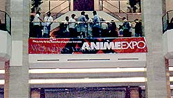 Welcome to Anime Expo! This is the sight that convention attendees were greeted with as they arrived at the Anaheim Hilton and Towers. The banner pointed the world toward the festivities happening on the 2nd floor. Here, people mingle waiting for Main Programming to open for the Opening Ceremonies. |