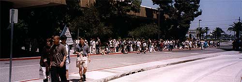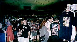 And boy, was the Exhibit Hall frequented! This is a shot of the LOOOOOOONG line of fans waiting to break into the goods and find that last laserdisc or that garage kit that was so long missing from their collection. Even hours before the Hall opened, the line was there. It just goes to show that merchandise is a big draw to an anime con. |