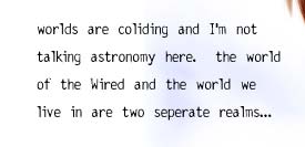 A particularly disturbing moment in Lain occurs when the Wired protocol is indeed changed, and viewers see Lain's sister miming the actions of dialing a telephone number and subsequently making the sounds of a failed data connection. It took some time to comprehend what had happened: she missed the protocol change, and her "mental modem" can no longer connect. One can only fervently wish that this is not ultimately in store for the users of the Internet -- that if one misses the next step that means missing everything thereafter and the resulting inability to understand what has gone before. Of course, the internet is a rather irascible child when compared to the Wired. Even with the most modern microwave and fiber-optic connections, information still gets delayed, lost or misrouted due to everything from downed phone lines to failing computer hardware to buggy software or even non-technological events like sunspots or one's pet cat knocking a phone off the hook and causing a modem connection to drop. The Wired has evolved past this primitive state, to the point where bandwidth is sufficient to support consciousness.