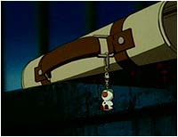 The show's opening titles are intriguing, as they show Lain walking through a shifting series of backgrounds and situations underpinned by music very suggestive of a Suzanne Vega or Sheryl Crow ballad, and often Lain appears in such scenes as the character on a TV screen, seeming to interact with the people in the room. The final opening title scene shows Lain losing her cap in a gust of wind, but then the scene freezes, becoming somewhat like an old photograph, save for Lain who walks away after a moment, leaving the cap suspended in the air and giving the viewer the first taste of the flexible reality of her world.