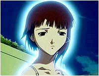 The story itself begins with a young girl, Yomoda Chisa, at first seen doubled over in despair in a Tokyo alley and next seen standing precariously on the edge of a building's roof, grasping the handrail while trying to decide something. The depression of her existence seems suddenly to lift as her expression resolves into one of freedom, and indeed she looks much like a bird about to take flight as she comes to a decision and lets go of the railing -- only to fall a dozen stories to her death in what appears to be suicide. Things are not this final, however. At school the next day, one girl is driven to tears as she receives an e-mail from the dead girl. On closer observation, the classmates soon discover that everyone received the same e-mail. When asked if she received it too, Lain answers "I don't check my e-mail," whereupon her friend Alice says she should check her e-mail everyday. Later, Lain is sitting quietly in her room contemplating, and then asks her father for a new Navi, which surprises and amuses the man. "So you've finally caught the bug, eh?" he muses. Later, as Lain gets used to her new Navi, Chisa starts talking to her from out of the iridescent wash of data on the display screen. In response to Lain's question about the girl's death, Chisa replies, "If you can overcome the fear, you'll find that you don't need your body here." And when Lain asks why she would want to be there, Chisa says, "Because God exists here."