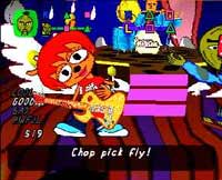 Much like Parappa the Rapper, Um Jammer Lammy uses the "Simon says" gameplay as its main focus. The player must hit a series of buttons in order and in rhythm to the music in order to score and move onto the next stage. Only difference this time is that Um Jammer Lammy plays the guitar while Parappa rapped his way to stardom. The game's goal is simple, get Lammy to the concert hall to play at Milkcan's first live gig. Sound easy, right? NOT!