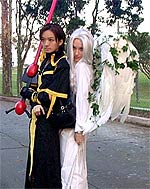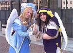 It may just be me but in all the years I've been to anime cons, I've never really paid much attention to the one thing that causes most anime fans to attend conventions. No, not the Dealer's Room (although that is a VERY good reason to come if you have fundage to spend). An anime con is one of the few places where who you are and what you can do has virtually no boundaries. Of course, I'm referring to the art of cosplaying. From immensely popular characters like Sailor Moon and Sakura to the ultimately obscure characters that sometimes need explanation, you can find examples of creativity everywhere... Looking down again, I see Chun Li, Chun Li and Chun Li from Street Fighter, one pink, one purple and one red. A few steps away, a few of my online friends are posing for the cameras donning pairs of bright white wings while Vash the Stampead promotes the virtues of love and peace. There's always a lot to see, if you just take the time to look for it. And I never mind having a cute Sailor Jupiter and Sailor Mercury stand in front of me. ^_^ The characters are everywhere.