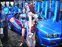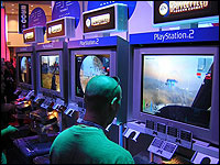 One of the biggest surprises for me was at EA’s booth. After watching a video for Burnout 3, I thought I’d play it. I’m not usually big on racing games, but it looked cool. So I went and tried it out, and I have to say it’s going to be really cool. It’s the typically racing game formula; you pick a car and race around a track that is laid out in a city. The big difference here is that there is traffic going throughout the city as you race, and you get rewarded for taking out the other cars with nitro boosts. You take out other cars by forcing them into walls and some of the traffic. The really cool thing is that when you crash everything slows down and your able to maneuver your car, to some extent, to try and take out your opponents while you crash. The graphics are surprisingly good, for the number of cars there are on the road and for the damage that appears on the cars.