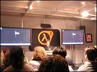 After I stood in line for the one of the Half Life 2 trailers. The footage they show, showed off more of what they had shown off the previous year. It was really cool to see the game in action for real. The levels seem really open, and allow you to explore and use terrain as you see fit. It seems as though they made it perfectly realistic. The game looks like it’s going to be really intense, and the AI looks incredible smart. One of the great parts about the video was that they showed us what Counter Strike will look like on the new engine. And I have to say that I can’t wait to play the new CS. They showed us one of the classic levels, which for the most part looked the same, but the finer details made it so much better, like the splashes of water from footsteps and bullets. Also the canisters that could be knocked over to prevent them from being used as cover.
